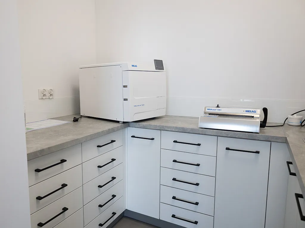 W MDent przykładamy ogromną wagę do bezpieczeństwa naszych pacjentów - dlatego posiadamy własną, w pełni wyposażoną sterylizatornię, w której narzędzia przechodzą wieloetapowy proces dezynfekcji i sterylizacji. Każdy etap, od mycia i dezynfekcji, przez pakowanie narzędzi w rękawy sterylizacyjne, aż po sterylizację w autoklawie klasy medycznej, odbywa się zgodnie z aktualnymi normami i procedurami.